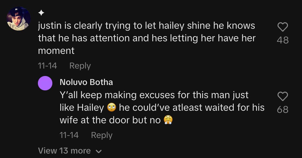 This time however, I’ve seen far fewer videos on socials, and the one’s that I have seen have focused even more disproportionately on Hailey and Selena than they usually do. Of course, the discourse has always pitted these two women against one another, and leant into the narrative that both are “crazy” and “jealous.” Classic misogynistic fodder. However this time, these comments and takes are truly dominating the conversation. The ‘jelena’ stans have been in full force, in spite of Selena having recently gotten married and having talked openly about how she faced emotional abuse from Justin—which Justin has also openly admitted to. I’ve also seen many videos analyzing Hailey’s psyche and why she would stay with this man, without any call out of his egregious behaviour. And I’ve also seen far more videos than normal defending him, with zoom ins on blurry photos as evidence that he actually was at her birthday party, claims that since it was a Rhode event he shouldn’t have had to have been there, or even claims that he left her in the back of the car alone with minimal security because he wanted her to have her moment (girl, what?).